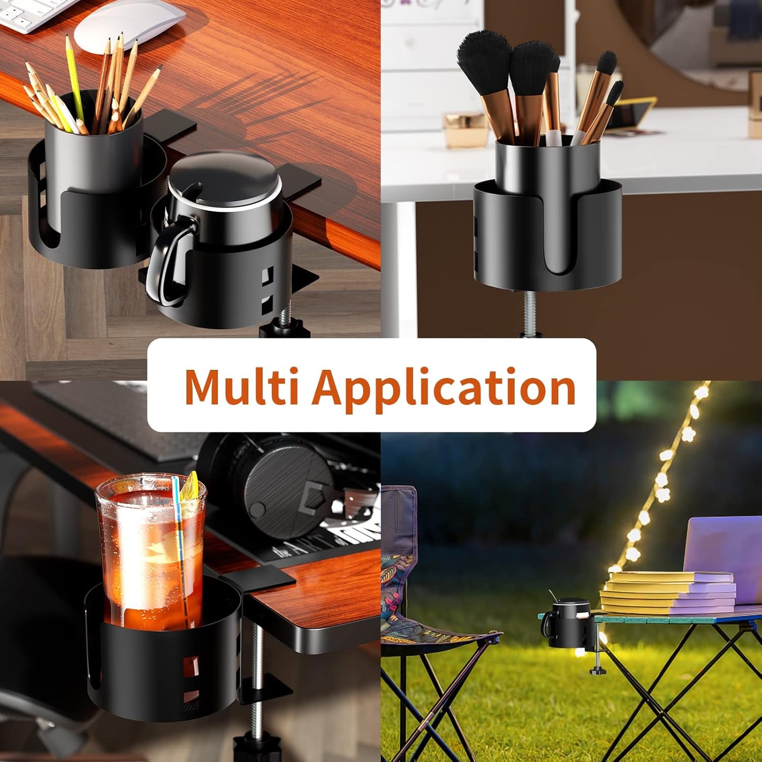 Upgraded Large Desk Cup Holder Clamp, Anti-Spill Table Cup Holder, Metal Office & PC Gaming Desk Accessories, Compatible with Universal Cup, Bottles, Pencil Holder (Black)